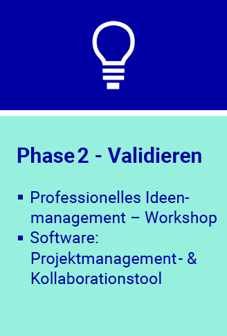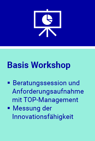 Unser Innovations-Angebot ist modular aufgebaut und kann zudem durch optionale Leistungen erweitert werden. Durch diese Flexibilität können sowohl Unternehmen, welche bereits ein Innovationsmanagement aufgebaut haben, als auch Unternehmen, die bislang noch über keine Erfahrungen im Innovationsmanagement verfügen, davon profitieren.