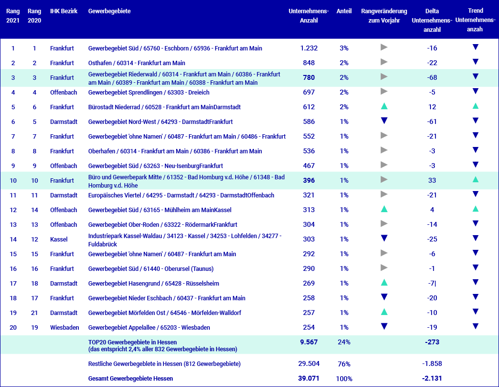 Entwicklung Top 20 Gewerbegebiete Hessen (März 2021 vs. März 2020)