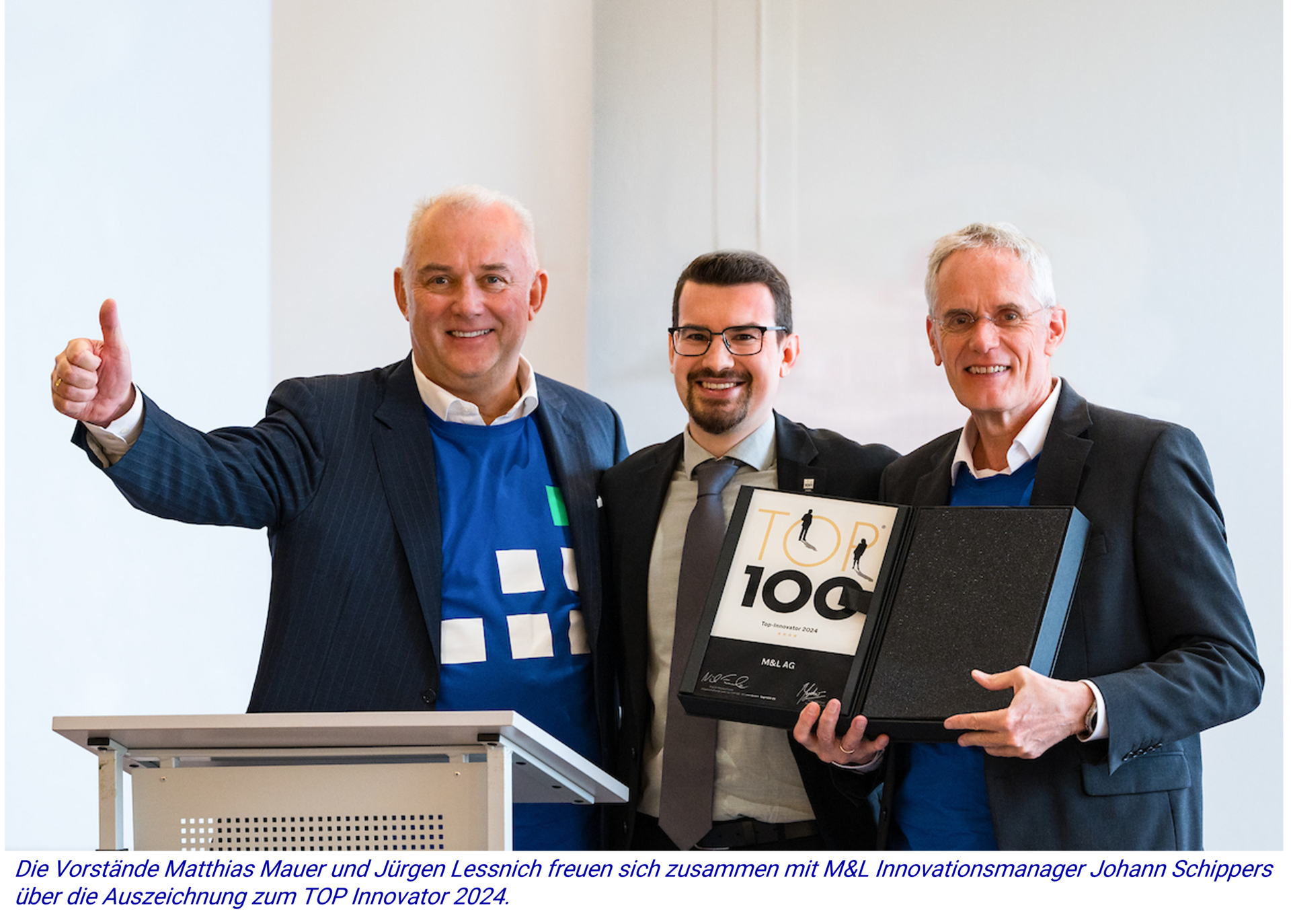 In dem wissenschaftlichen Auswahlverfahren beeindruckte M&L AG in der Größenklasse A (bis 50 Mitarbeiter) besonders in der Kategorie „Innovationsförderndes Top-Management“. TOP 100 ist seit 30 Jahren der einzige Wettbewerb in Deutschland, der das Innovationsmanagement und den Innovationserfolg mittelständischer Unternehmen auszeichnet. Das heißt: TOP 100 bewertet keine einzelnen Produkte, sondern nimmt alle Stufen des Innovationsprozesses genau unter die Lupe. Folgende Kategorien werden dabei geprüft: „Innovationserfolg“, „Innovationsklima“, „Innovative Prozesse und Organisation“, „Außenorientierung/Open Innovation“ und „Innovationsförderndes Top-Management“.