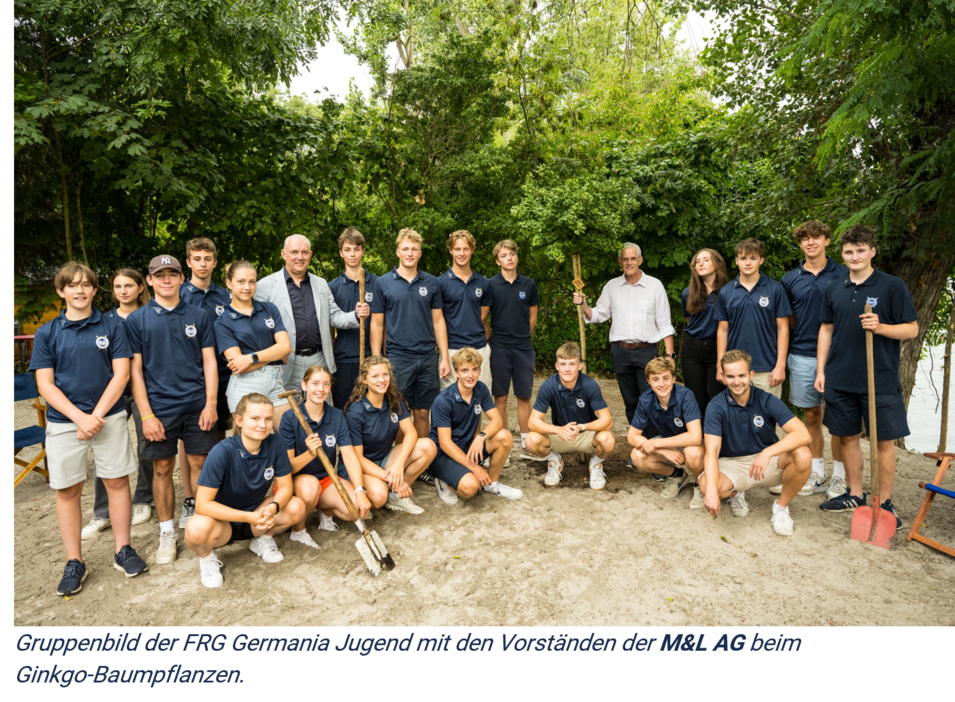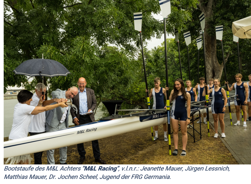 Bei etwas wechselhaftem Wetter traf sich die M&L Gemeinschaft am Samstag, 15. Juli 2023 am neuem Jugend- und Schulruderzentrum Grunelius Bootshaus in Niederrad, um das 30 jährige Jubiläum der M&L AG zu feiern. Zu den Gästen gehörten neben der Jungend und der Honoratioren der Germania auch Partner, Kunden, Freunde und Mitarbeiter der M&L AG mit ihren Familien. Stadtrat Claus Möbius überbrachte Gruß- und Dankesworte der Stadt Frankfurt. Ein buntes Programm, das von der Germania Jugend tatkräftig unterstützt wurde, führte die Gemeinschaft durch den Tag, brachte den anwesenden Gästen den Rudersport näher und vertiefte die freundschaftliche Zusammenarbeit mit der FRG Germania. Neben der Bootstaufe und Jungfernfahrt des neuen M&L Achters "M&L Racing", gab es die Möglichkeit für die Gäste eine Bootsfahrt mit dem Kirchboot zu machen oder an den Ergometern der Germania das Trocken-Training kennen zu lernen. Symbolisch für die langfristig ausgelegte Zusammenarbeit wurde auch ein Ginkgo-Baum auf dem Gelände gepflanzt. Verschiedene Spiele und kulinarische Köstlichkeiten boten Spaß und Unterhaltung für Groß und Klein.