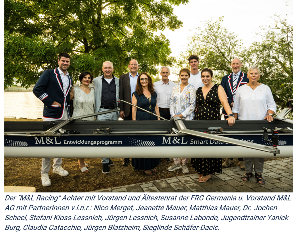 Bei der familiären Feier waren auch die Vorstände und Jugendgruppen der Germania anwesend. Zusammen mit weiteren Gästen und Kunden der M&L sowie den M&L MitarbeiterInnen und ihren Familien, wurde ein buntes Programm geboten – unterstützt und begleitet von der Jugend und den Trainern der FRG Germania. Gefeiert wurde, neben dem 30-jährigen Bestehen der M&L AG, auch das M&L Entwicklungsprogramm zur Jugendförderung der Germania. Die Bootstaufe des ersten M&L Achters "M&L Racing" und dessen Jungfernfahrt auf dem Main gehörten zu den besonderen Highlights des Tages.