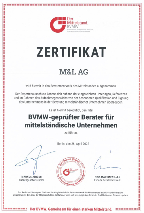 Mit der Zertifizierung durch den BVMW erhalten wir ein weiteres Gütesiegel und werden Teil des bundesweiten Beratungsnetzwerks des deutschen Mittelstandes. Als Beratungsunternehmen ist es unser Anliegen, dem Mittelstand durch unsere Leistungen einen konkreten Mehrwert zu schaffen, der zu wertvollen und beträchtlichen Wettbewerbsvorteilen führt.